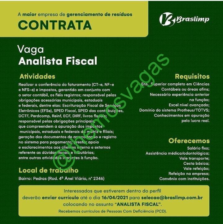 –  Interessados(as) e que atendam ao perfil solicitado acima, devem enviar o currículo até 16/04/2021  para o e-mail selecao@braslimp.com.br, contendo no título/assunto “Analista Fiscal – FOR”.
