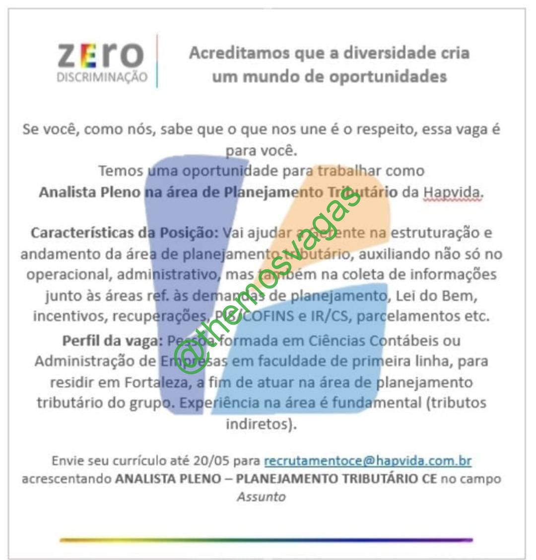 – Interessados(as) e que atendam ao perfil solicitado acima, devem enviar o currículo para o e-mail recrutamentoce@hapvida.com.br, contendo no titulo/assunto “Analista Pleno – Planeamento Tributário – FOR