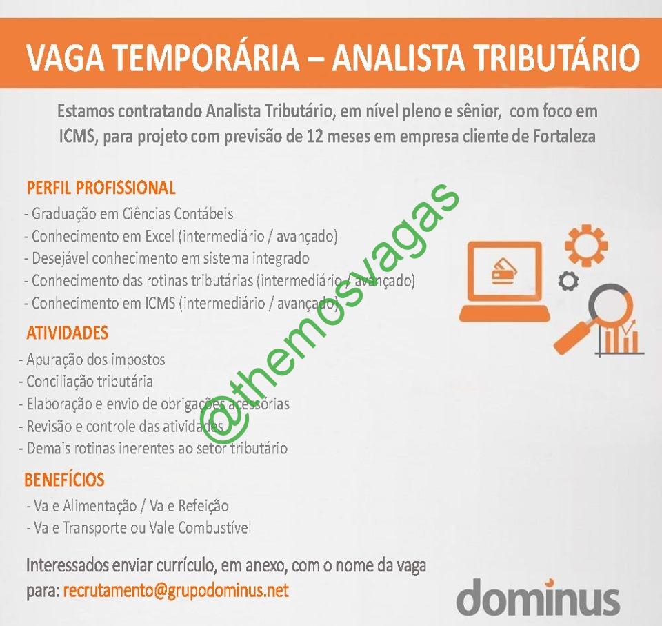 – Interessados(as) e que atendam ao perfil solicitado acima, devem enviar o currículo para o e-mail recrutamento@grupodominus.net , colocando no título “Analista Tributário”.