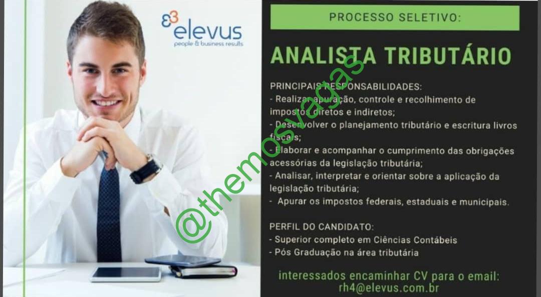 – Interessados(as) e que atendam ao perfil solicitado acima, devem enviar o currículo para o e-mail rh4@elevus.com.br, contendo no titulo/assunto “Analista Tributário – FOR
