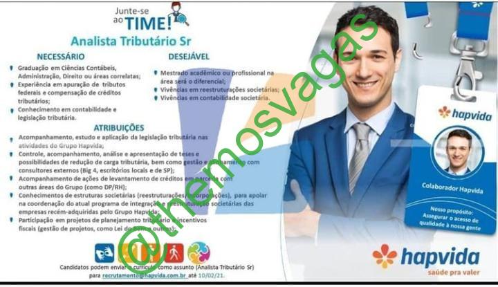 – Interessados(as) e que atendam ao perfil solicitado acima, devem enviar o currículo para 10/02/2021 para o e-mail recrutamento@hapvida.com contendo no título/assunto “Analista Tributário Sr – FOR”.