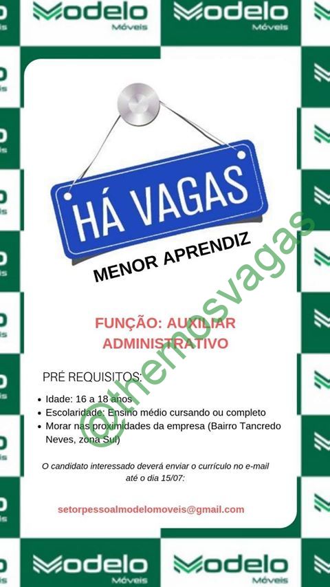 – Interessados(as) e que atendam aos requisitos devem enviar o perfil profissional até o dia 15/07/2019, colocando no título do e-mail “Aprendiz THE”, para:  setorpessoalmodelomoveis@gmail.com