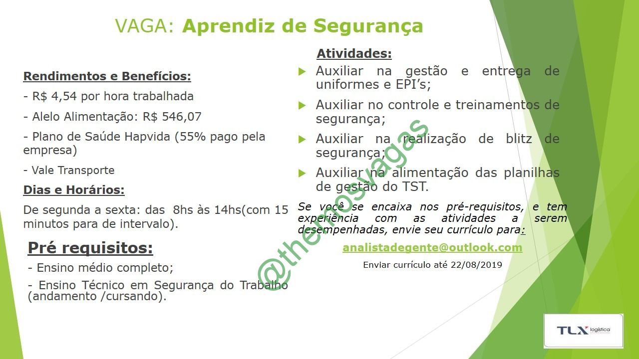 – Interessados(as) e que atendam ao perfil solicitado acima, devem enviar o currículo até 22/08/2019 para o e-mail analistadegente@outlook.com contendo no título/assunto “Aprendiz de Segurança THE”.