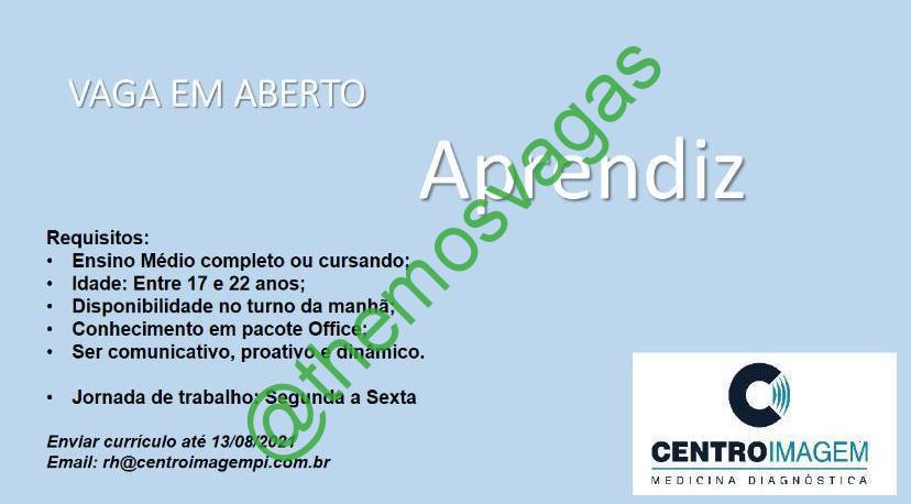 – Interessados(as) e que atendam ao perfil solicitado acima, devem enviar o currículo até 13/08/2021 para o e-mail rh@centroimagempi.com.br , contendo no título/assunto “Aprendiz THE“.