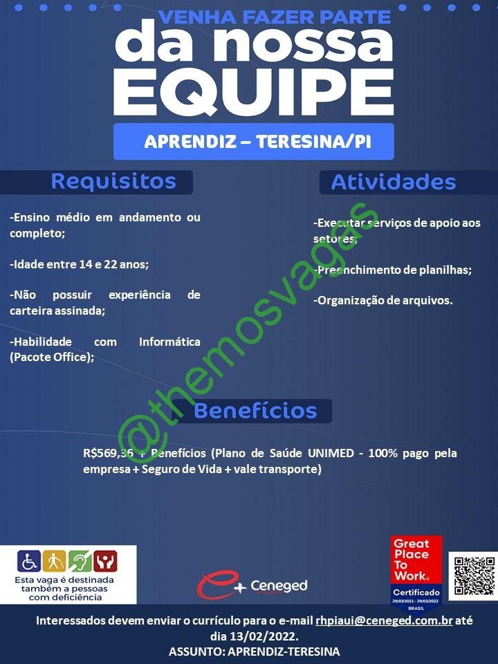 – Interessados(as) e que atendam ao perfil solicitado acima, devem enviar o currículo até 13/02/2022  para o e-mail rhpiaui@ceneged.com.br contendo no título/assunto “Aprendiz-Teresina
