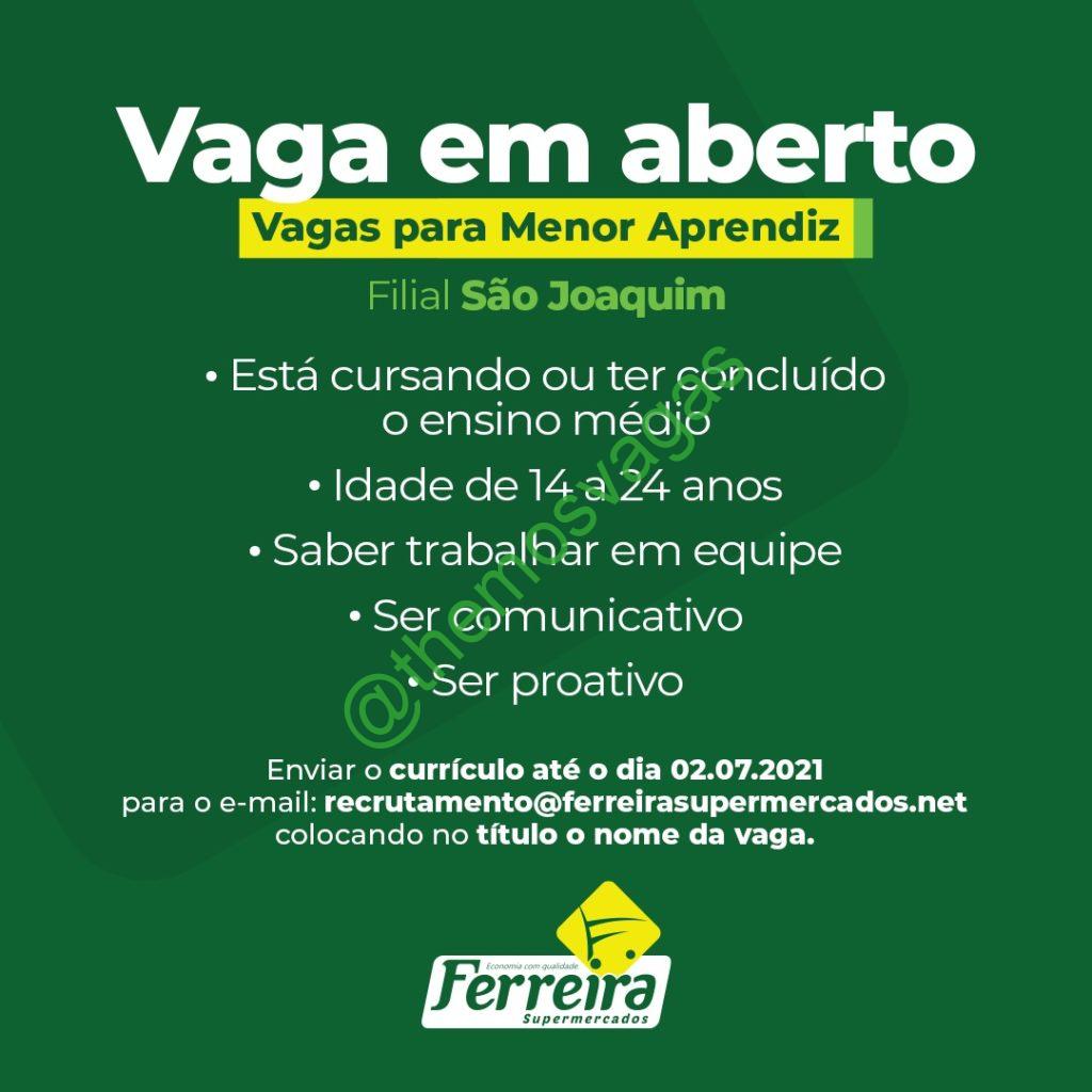 – Interessados(as) e que atendam ao perfil solicitado acima, devem enviar o currículo até 02/07/2021  para o e-mail recrutamento@ferreirasupermercados.net contendo no título/assunto “Aprendiz THE