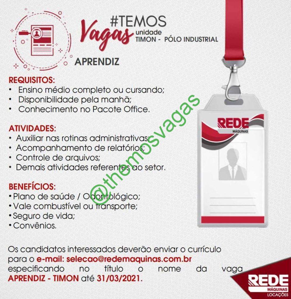 – Interessados(as) e que atendam ao perfil solicitado acima, devem enviar o currículo até 31/03/2021 para o e-mail selecao@redemaquinas.com.br contendo no título/assunto “Aprendiz Timon