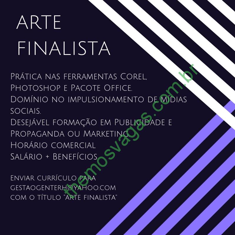 Interessados(as) e que atendam aos requisitos devem enviar o perfil profissional, colocando no título do e-mail “Arte Finalista”, para: gestaogenterh@yahoo.com