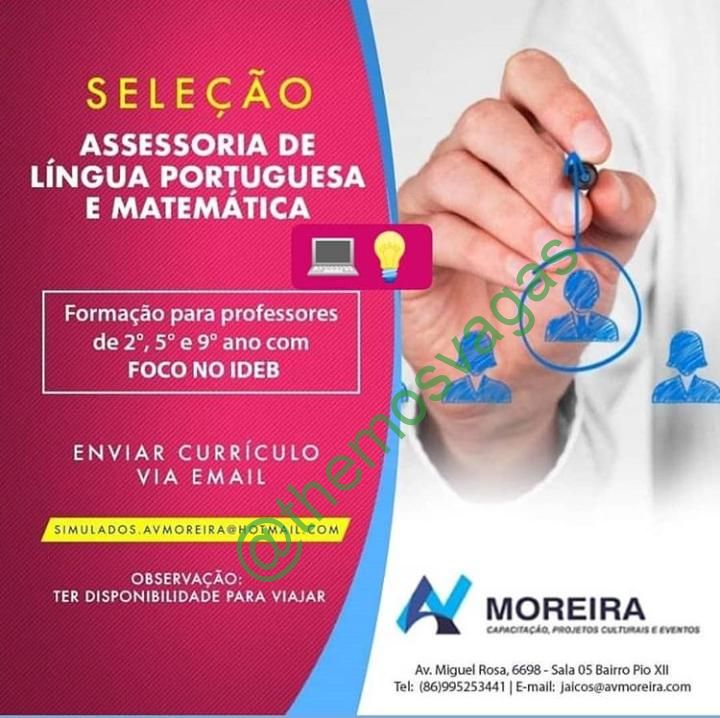 – Interessados(as) e que atendam aos requisitos devem enviar o perfil profissional, colocando no título do e-mail “Teresina – PI”, para:  simulados.avmoreira@hotmail.com