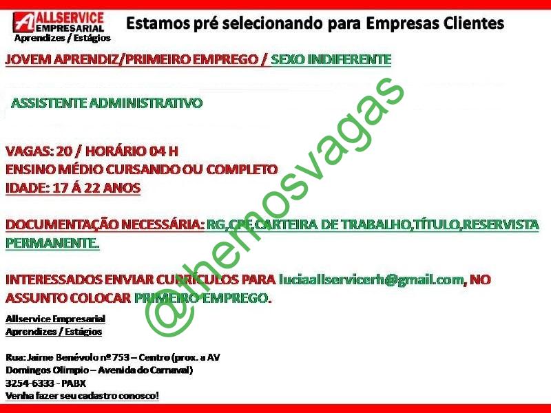 – Interessados(as) e que atendam ao perfil solicitado acima, devem enviar o currículo para o e-mail luciaallservicerh@gmail.com, contendo no titulo/assunto “Assistente Administrativo FOR”.
