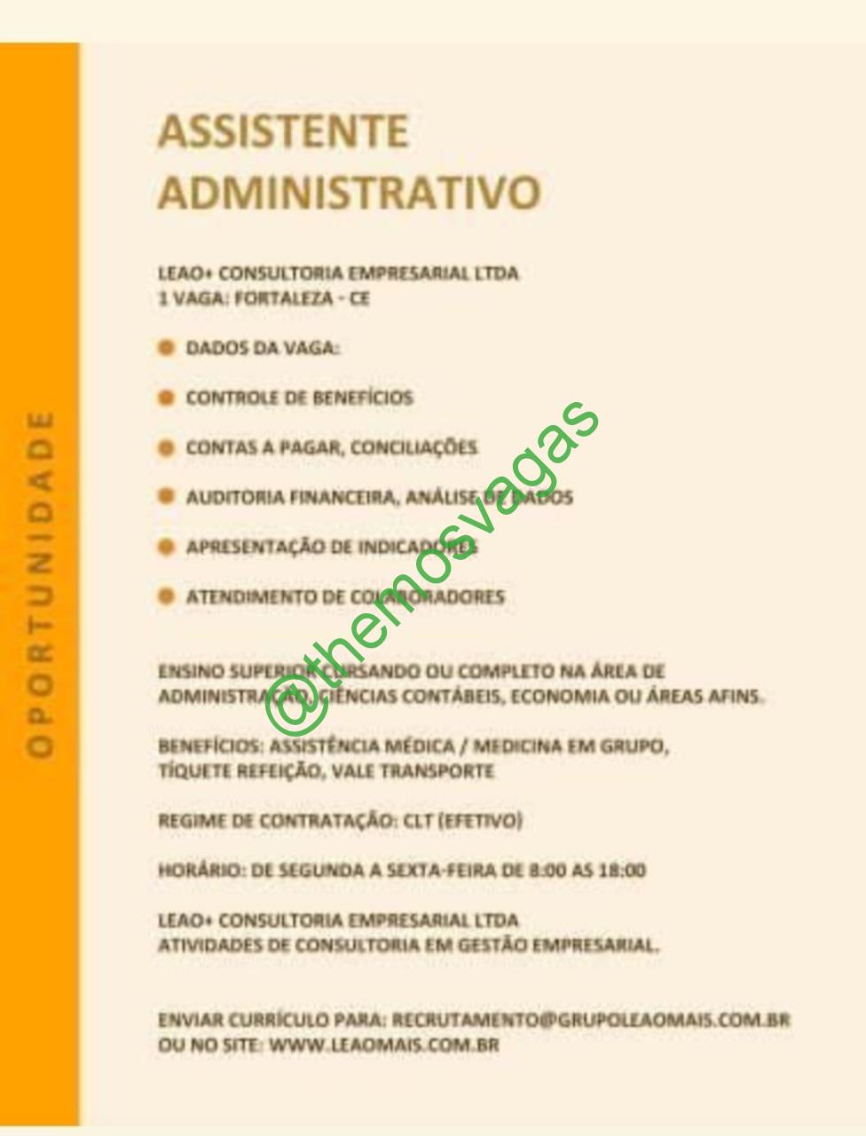 – Interessados(as) e que atendam ao perfil solicitado acima, devem enviar o currículo para o e-mail recrutamento@grupoleaomais.com.br, contendo no titulo/assunto “Assistente Administrativo – FOR”.