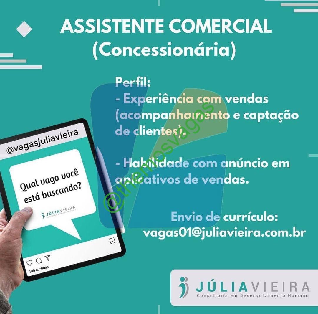 – Interessados(as) e que atendam ao perfil solicitado acima, devem enviar o currículo para o e-mail vagas01@juliavieira.com.br, contendo no titulo/assunto “Assistente Comercial FOR”.