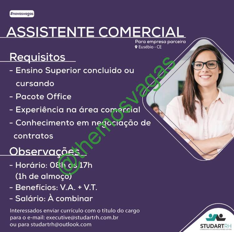 – Interessados(as) e que atendam ao perfil solicitado acima, devem enviar o currículo para o e-mail executive@studartrh.com.br, contendo no titulo/assunto “Assistente Comercial – FOR