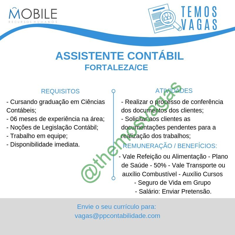 – Interessados(as) e que atendam ao perfil solicitado acima, devem enviar o currículo para o e-mail vagas@ppcontabilidade.com , colocando no título “Assistente Contábil”.