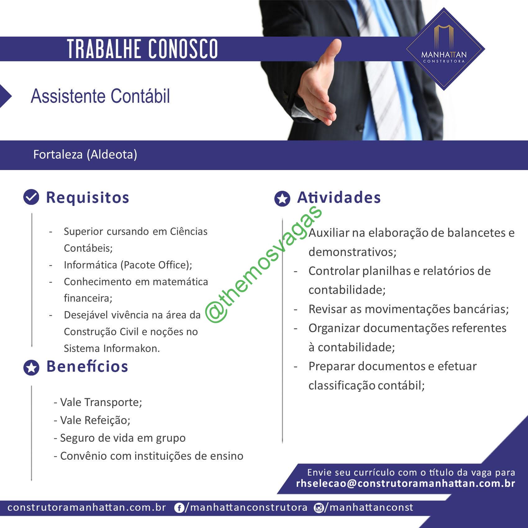 – Interessados(as) e que atendam ao perfil solicitado acima, devem enviar o currículo para o e-mail rhselecao@construtoramanhattan.com.br , colocando no título “Assistente Contábil”.