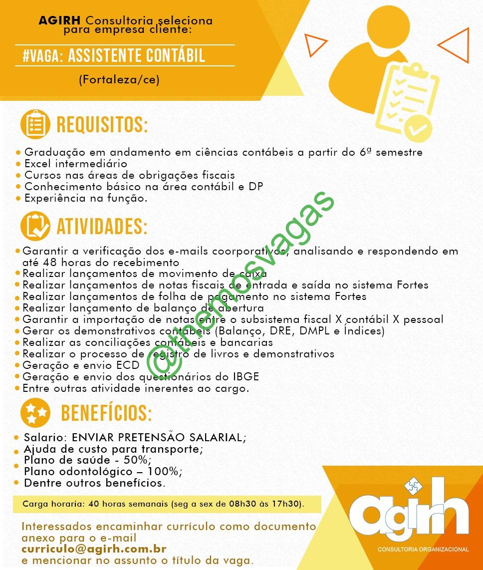– Interessados(as) e que atendam ao perfil solicitado acima, devem enviar o currículo para o e-mail curriculo@agirh.com.br , colocando no título “Assistente Contábil”.