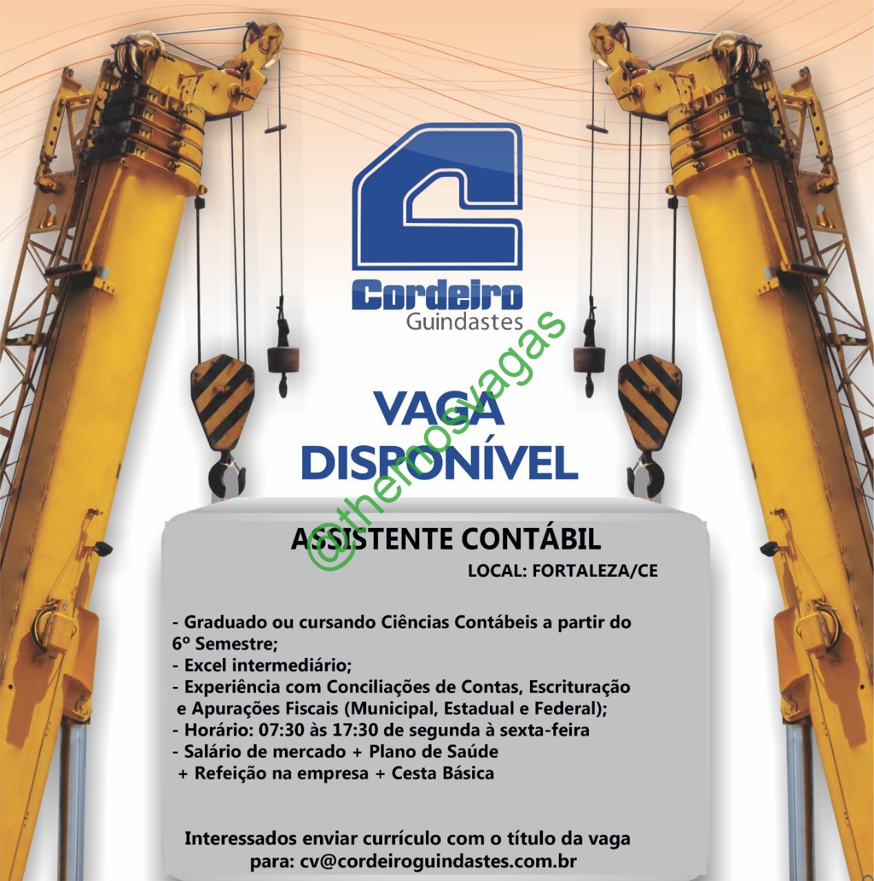 – Interessados(as) e que atendam ao perfil solicitado acima, devem enviar o currículo com pretensão salarial para o e-mail cv@cordeiroguindastes.com.br , colocando no título “Assistente Contábil – FOR