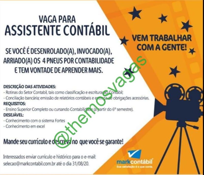– Interessados(as) e que atendam ao perfil solicitado acima, devem enviar até o dia 31/08/20 o currículo para o e-mail selecao@markcontabil.com.br , colocando no título “Assistente Contábil – FOR”.