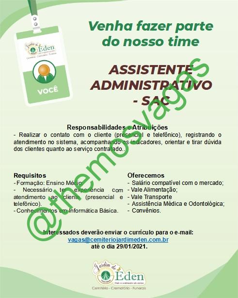 – Interessados(as) e que atendam ao perfil solicitado acima, devem enviar o currículo até 29/01/2021 para o e-mail vagas@cemiteriojardimeden.com.br, contendo no titulo/assunto “Assistente de Administrativo – FOR”.