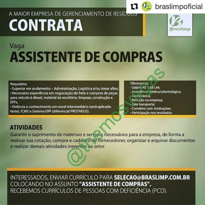 – Interessados(as) e que atendam ao perfil solicitado acima, devem enviar o currículo para o e-mail selecao@braslimp.com.br , colocando no título “Assistente de Compras”.