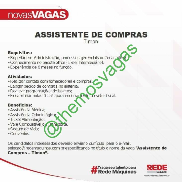 – Interessados(as) e que atendam ao perfil solicitado acima, devem enviar o currículo para o e-mail selecao@redemaquinas.com.br contendo no título/assunto “Assistente de Compras – Timon
