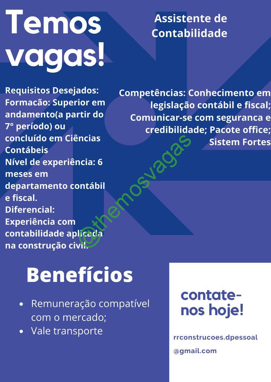 – Interessados(as) e que atendam ao perfil solicitado acima, devem enviar o currículo para o e-mail rrconstrucoes.dpessoal@gmail.com contendo no título/assunto “Assistente de Contabilidade THE