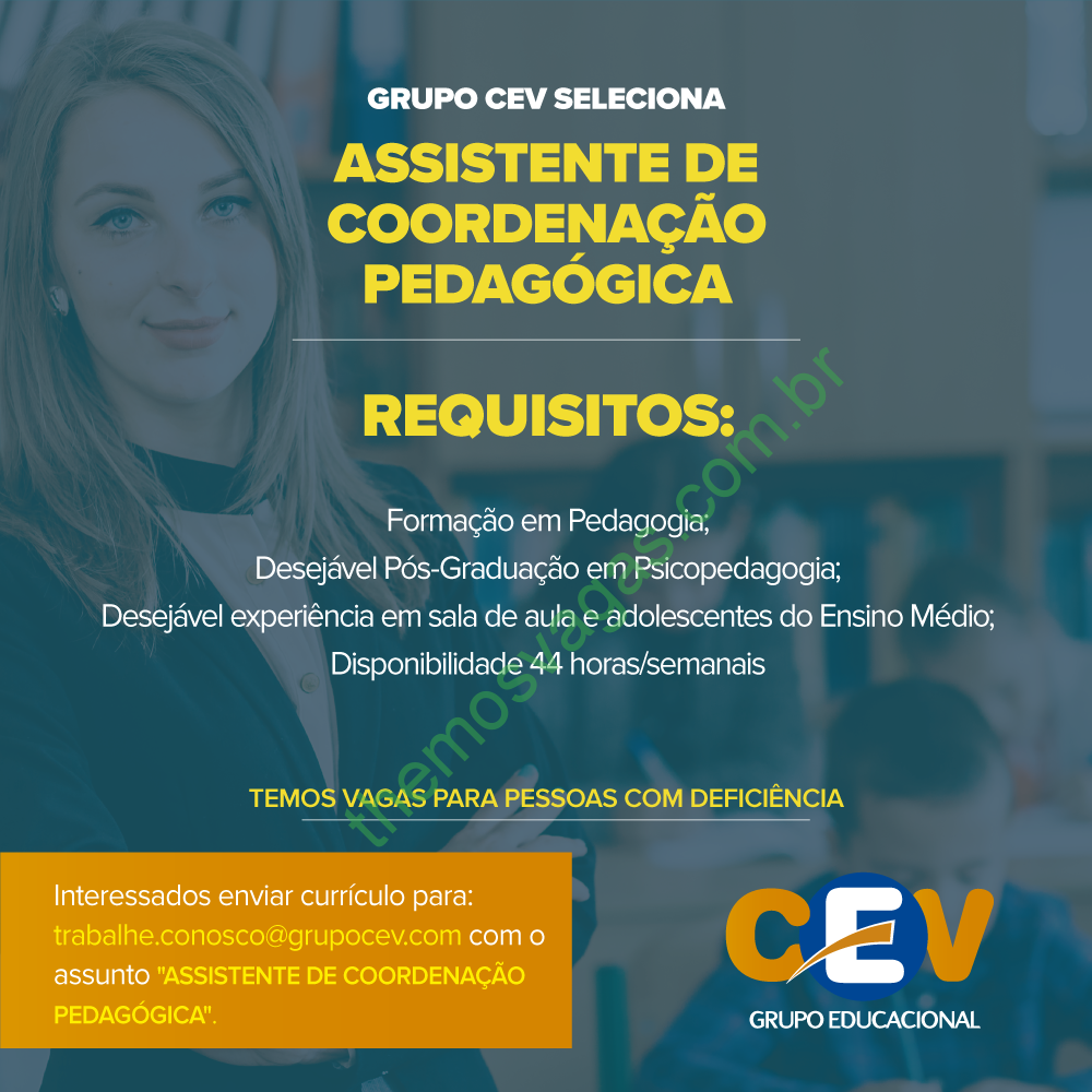 Interessados(as) e que atendam aos requisitos da imagem acima devem enviar o perfil profissional colocando no título/assunto do e-mail: “Assistente de Coordenação Pedagógica”, para trabalhe.conosco@grupocev.com .