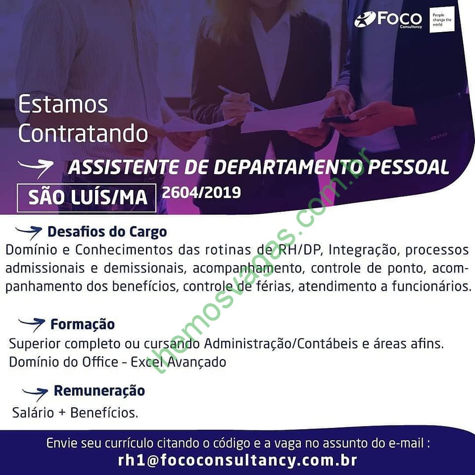 Interessados(as) e que atendam ao perfil solicitado na imagem acima devem enviar o currículo, contendo no título/assunto do e-mail o Código da vaga: 2604/2019 , para rh1@fococonsultancy.com.br