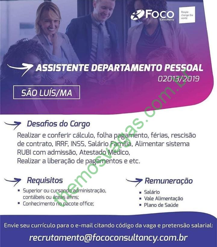 Interessados(as) e que atendam ao perfil solicitado na imagem acima devem enviar o currículo, contendo no título/assunto do e-mail o Código da vaga: “02013/2019 + Pretensão salarial”, para talenthunting@fococonsultancy.com.br