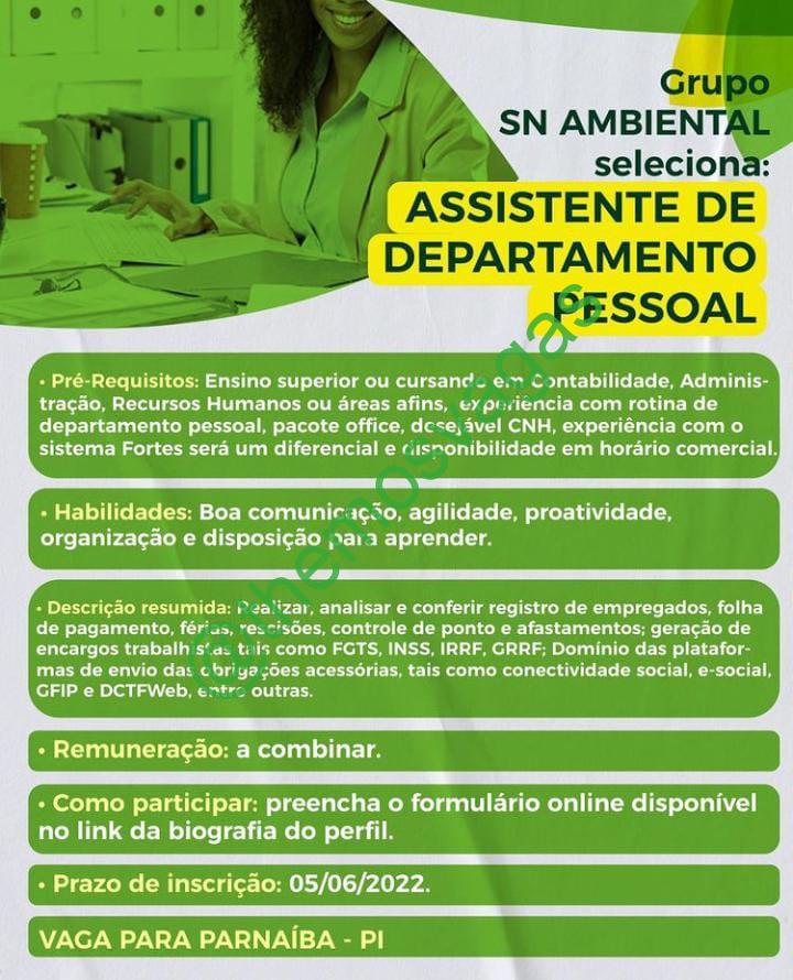 Assistente de Departamento Pessoal | Parnaíba – PI | 01 vaga(s)