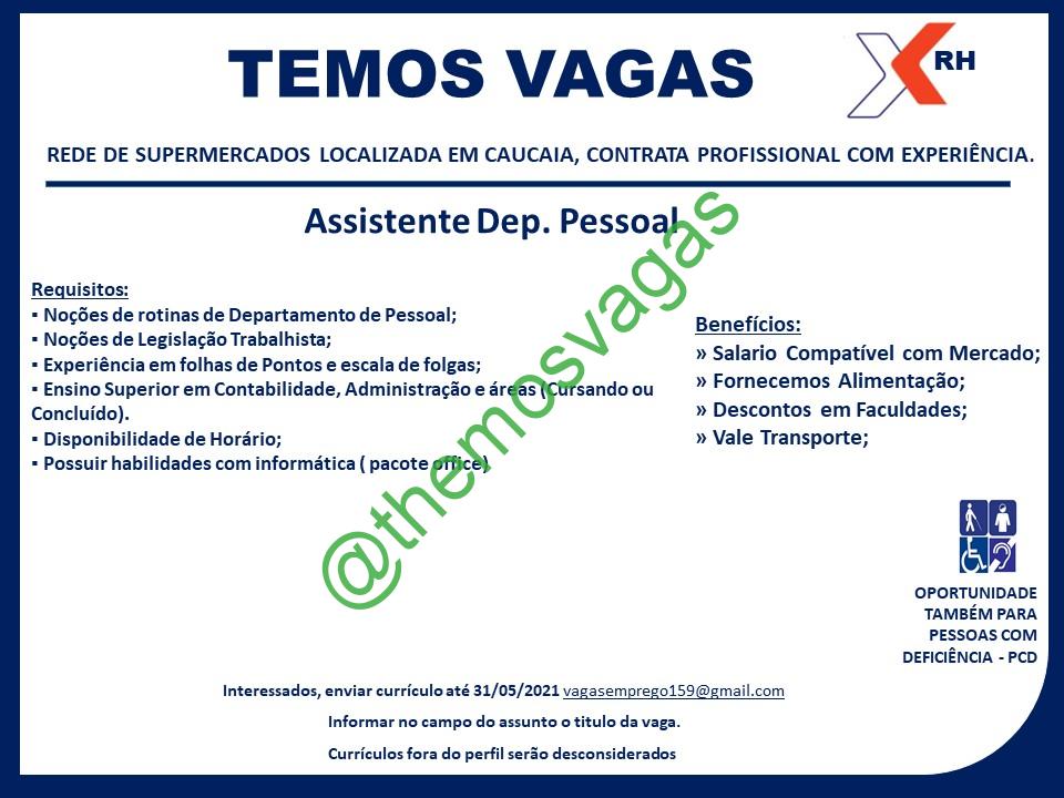 – Interessados(as) e que atendam ao perfil solicitado acima, devem enviar o currículo até 31|05|2021 para o e-mail vagasemprego159@gmail.com, contendo no título/assunto “Assistente de DP – Caucaia“.