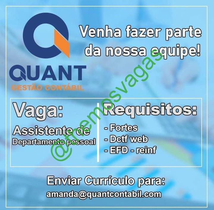 – Interessados(as) e que atendam ao perfil solicitado acima, devem enviar o currículo para o e-mail amanda@quantcontabil.com, contendo no título/assunto “Assistente de DP – FOR”.