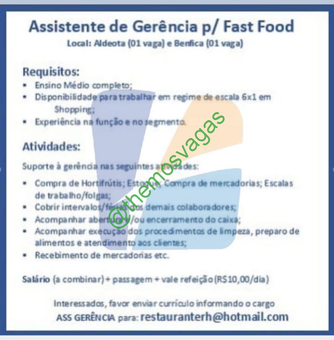 – Interessados(as) e que atendam ao perfil solicitado acima, devem enviar o currículo para o e-mail restauranterh@hotmail.com, contendo no titulo/assunto “Assistente de Gerência – FOR