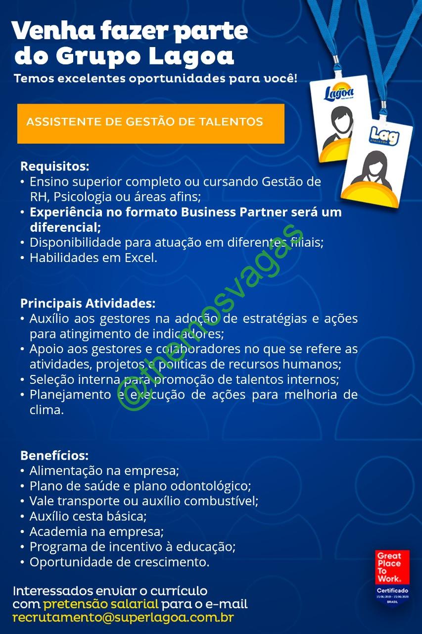 – Interessados(as) e que atendam ao perfil solicitado acima, devem enviar o currículo com pretensão salarial para o e-mail recrutamento@superlagoa.com.br, contendo no titulo/assunto “Assistente de Gestão de Talentos – FOR”