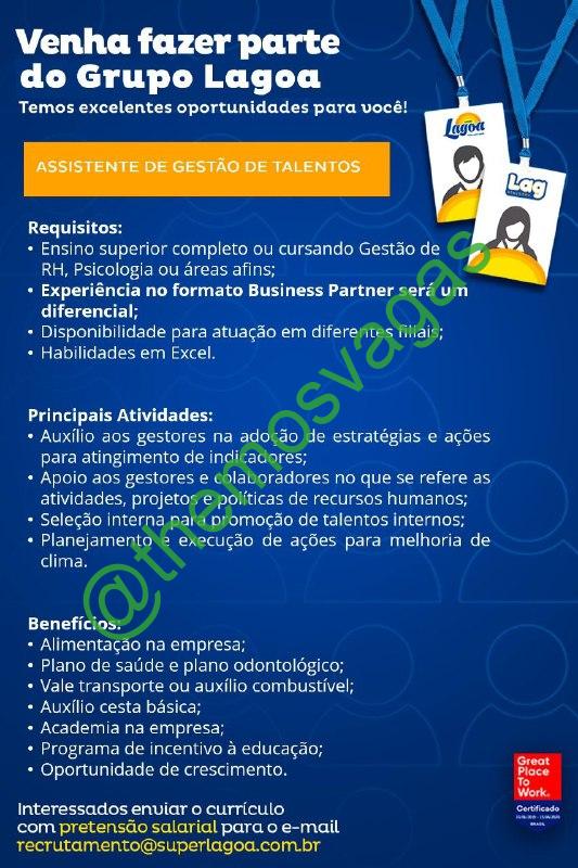– Interessados(as) e que atendam ao perfil solicitado acima, devem enviar o currículo com pretensão salarial para o e-mail recrutamento@superlagoa.com.br, contendo no titulo/assunto “Assistente de Gestão – FOR