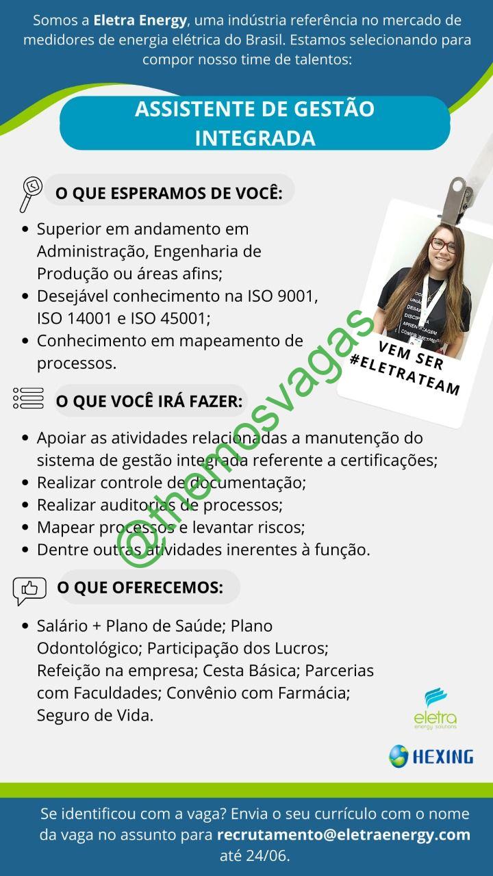 – Interessados(as) e que atendam ao perfil solicitado acima, devem enviar o currículo até 2|06|2021 para o e-mail recrutamento@eletraenergy.com, contendo no titulo/assunto “Assistente de Gestão Integrada – FOR