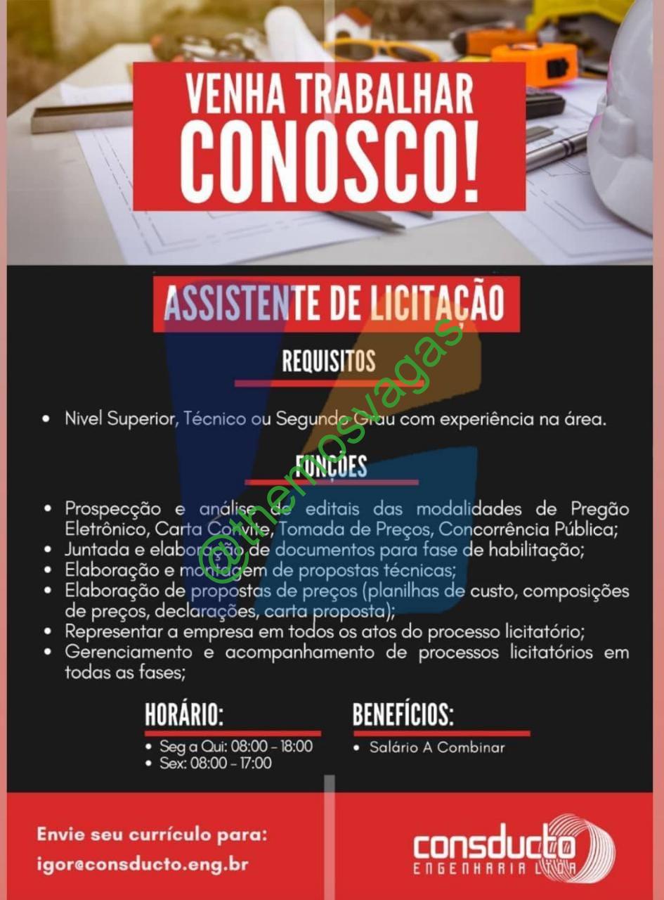 – Interessados(as) e que atendam ao perfil solicitado acima, devem enviar o currículo para o e-mail igor@consducto.eng.br, contendo no titulo/assunto “Assistente de Licitação – FOR