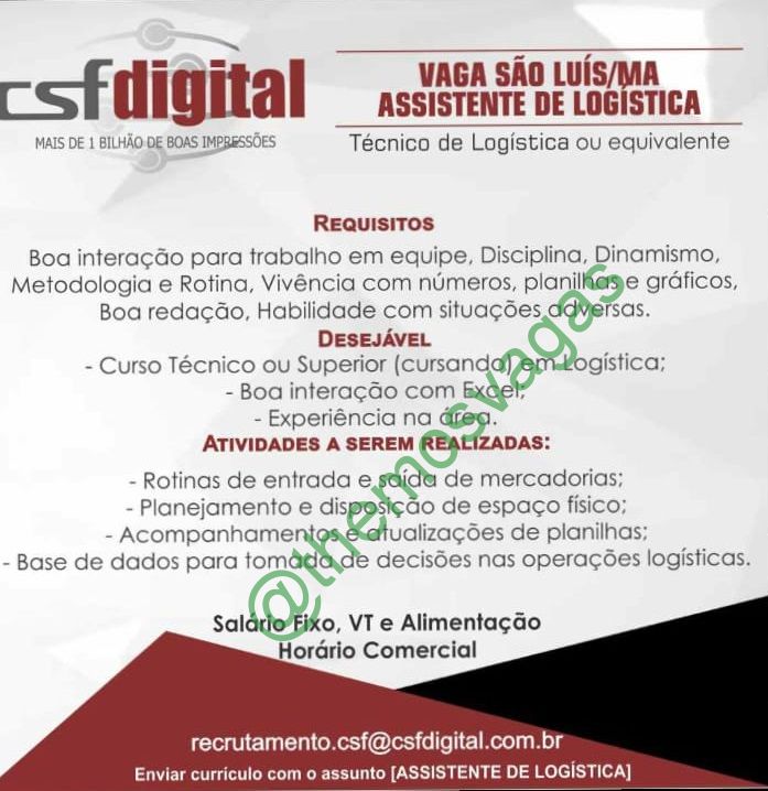 – Interessados(as) e que atendam ao perfil solicitado acima, devem enviar o currículo até /2019 para o e-mail recrutamento.csf@csfdigital.com.br contendo no título/assunto “Assistente de Logística SLZ”.