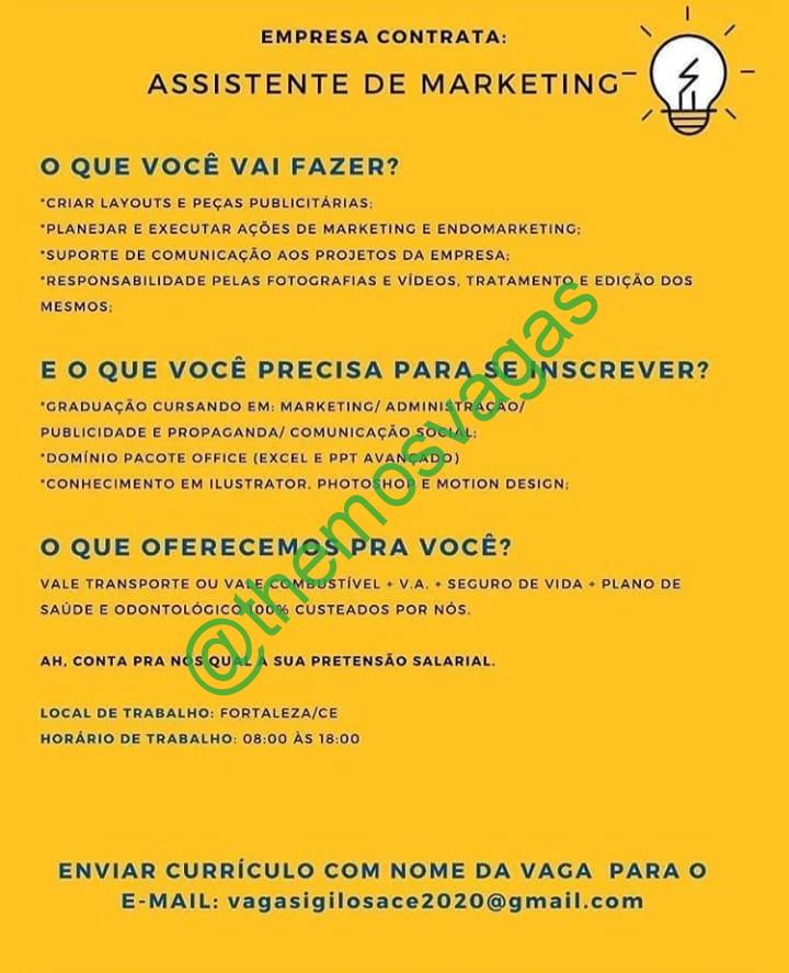 – Interessados(as) e que atendam ao perfil solicitado acima, devem enviar o currículo para o e-mail vagasigilosace2020@gmail.com , colocando no título “Assistente de Marketing”.