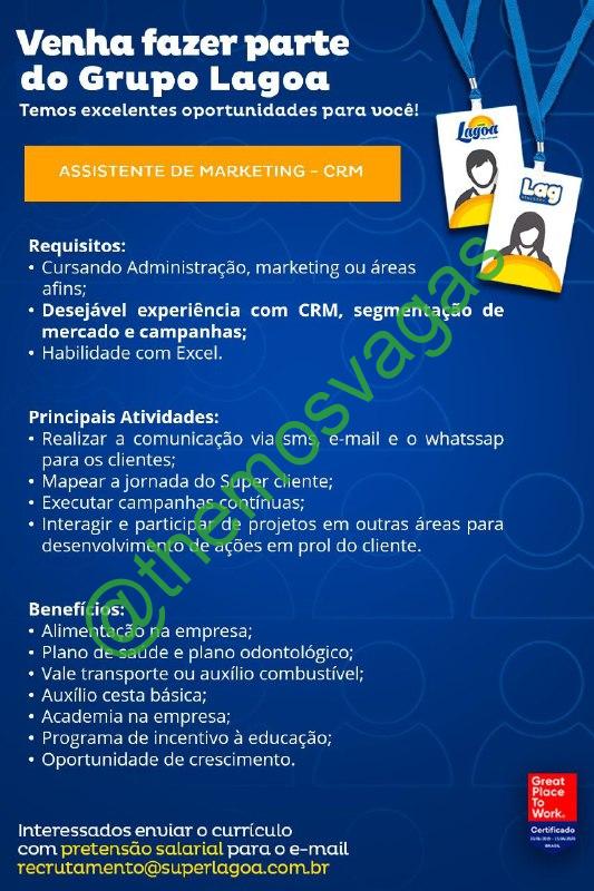 – Interessados(as) e que atendam ao perfil solicitado acima, devem enviar o currículo para o e-mail recrutamento@superlagoa.com.br, contendo no titulo/assunto “Assistente de Marketing – FOR”.