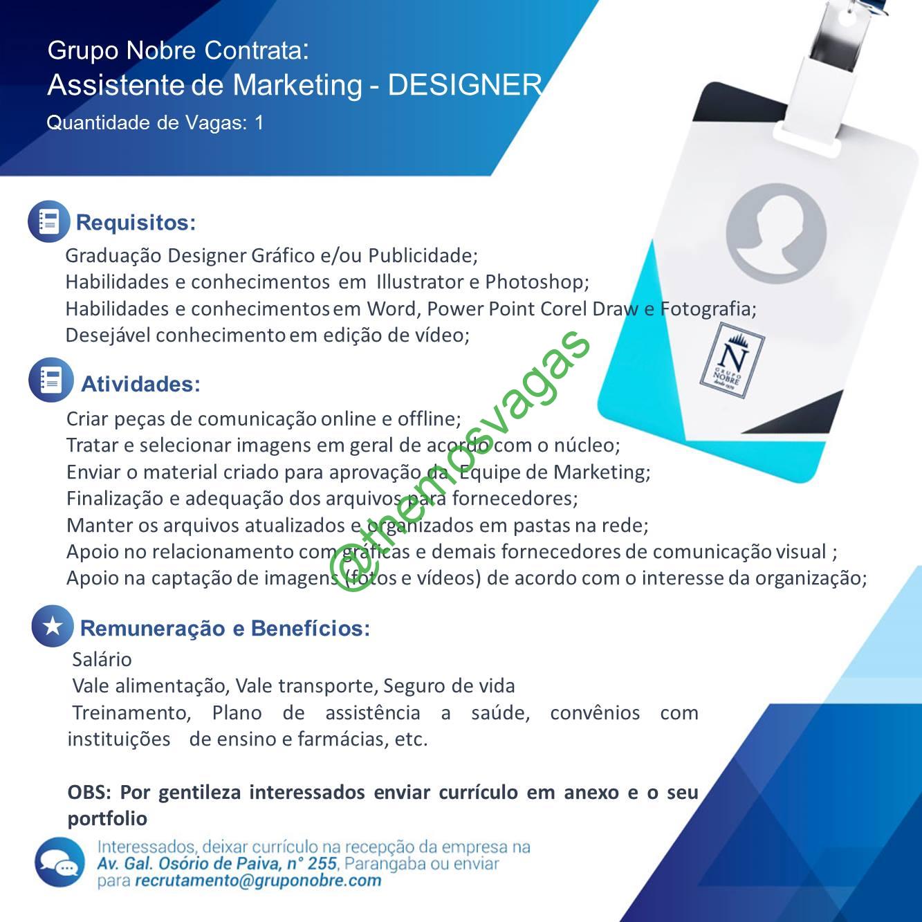 – Interessados(as) e que atendam ao perfil solicitado acima, devem enviar o currículo para o e-mail recrutamento@gruponobre.com, contendo no título/assunto “Assistente de Marketing – Designer – FOR