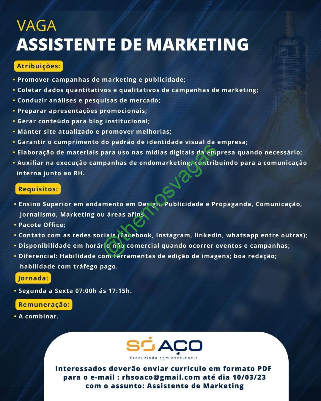 – Interessados(as) e que atendam ao perfil solicitado acima, devem enviar o currículo em formato PDF  até 10/03/2023 para o e-mail rhsoaco@gmail.com contendo no título/assunto “Assistente de Marketing“.
