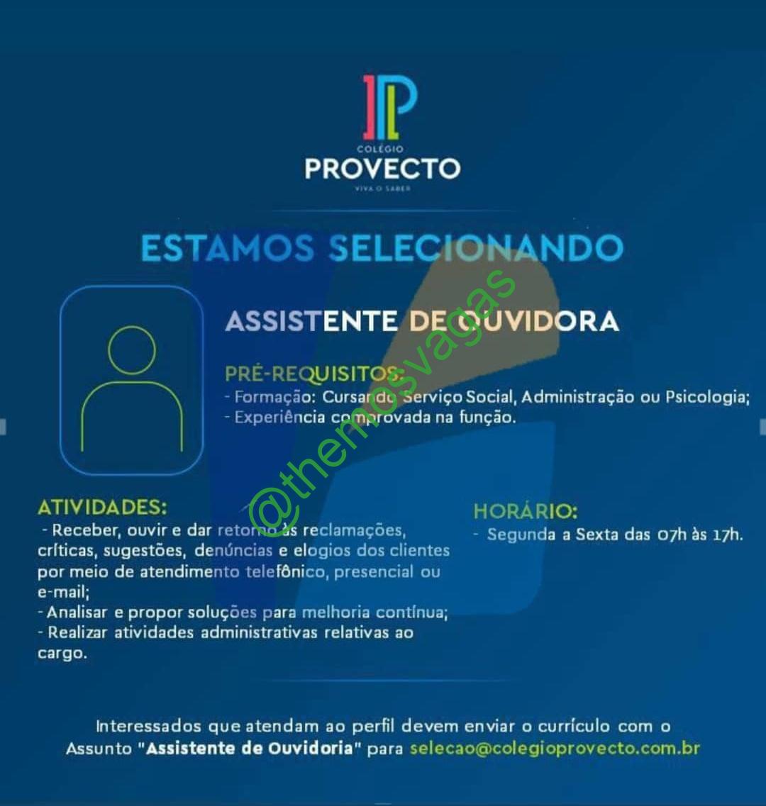 – Interessados(as) e que atendam ao perfil solicitado acima, devem enviar o currículo para o e-mail selecao@colegioprovecto.com.br, contendo no titulo/assunto “Assistente de Ouvidoria – FOR