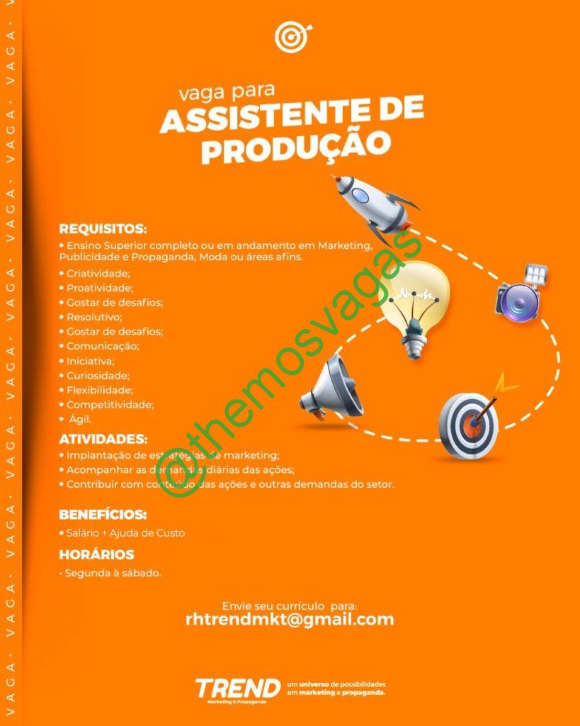 – Interessados(as) e que atendam ao perfil solicitado acima, devem enviar o currículo para o e-mail rhtrendmkt@gmail.com contendo no título/assunto “Assistente de Produção THE