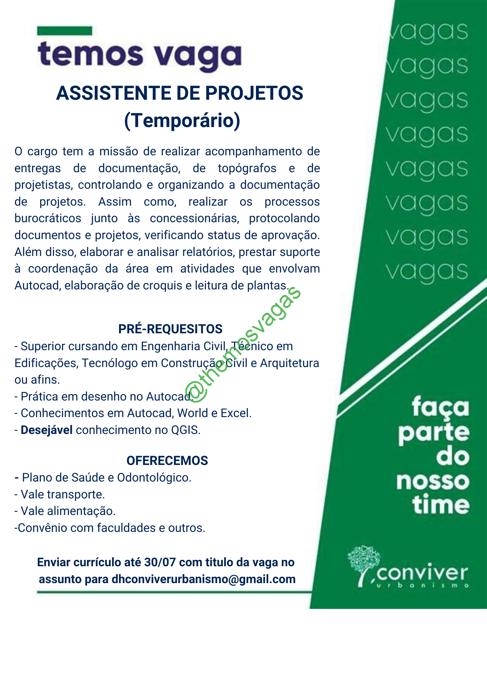 – Interessados(as) e que atendam ao perfil solicitado acima, devem até o dia 30/07/2020 enviar o currículo para o e-mail dhconviverurbanismo@gmail.com , colocando no título “Assistente de Projetos (Temporário)”.