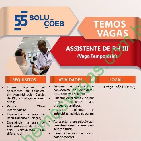 Interessados(as) e que atendam aos requisitos exigidos na imagem acima devem enviar o perfil profissional até 06/02/2019, contendo no título/assunto “ASSISTENTE RH SLZ”,  para oportunidades@55solucoes.com