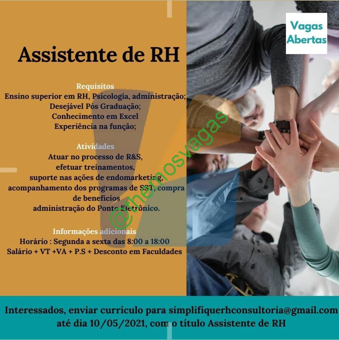 – Interessados(as) e que atendam ao perfil solicitado acima, devem enviar o currículo até 10/05/2021 com para o e-mail simplifiquerhconsultoria@gmail.com, contendo no título/assunto “Assistente de RH  – FOR”,