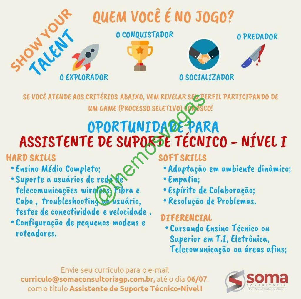 – Interessados(as) e que atendam ao perfil solicitado acima, devem enviar o currículo até 06/07/2020 para o e-mail curriculo@somaconsultoriagp.com.br contendo no título/assunto “Assistente de Suporte Técnico – Nível I
