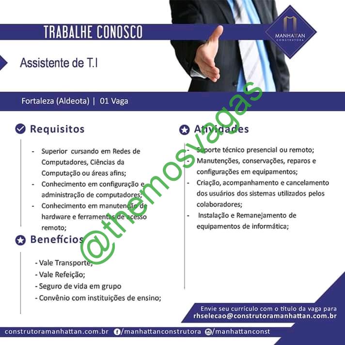 – Interessados(as) e que atendam ao perfil solicitado acima, devem enviar o currículo para o e-mail rhselecao@construtoramanhattan.com.br , colocando no título “Assistente de T. I.”.