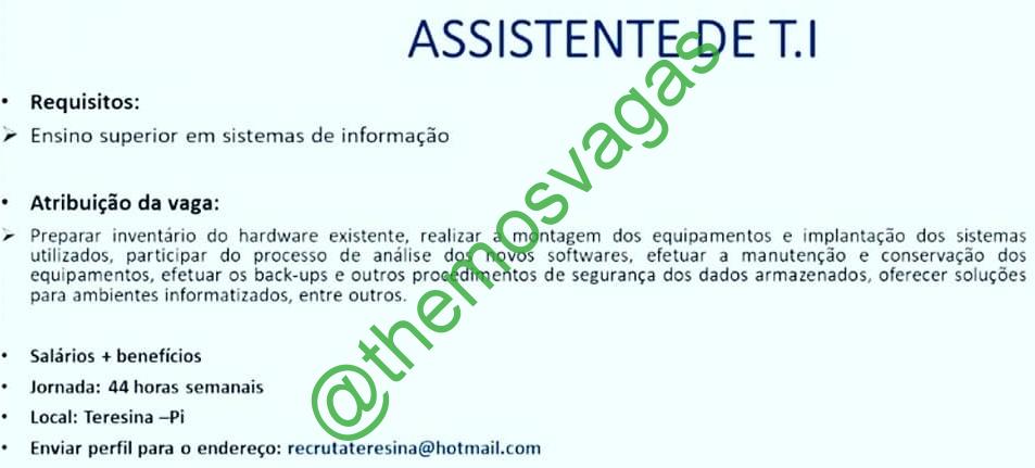 – Interessados(as) e que atendam ao perfil solicitado acima, devem enviar o currículo até /01/2020 para o e-mail recrutateresina@hotmail.com contendo no título/assunto “Assistente de TI THE